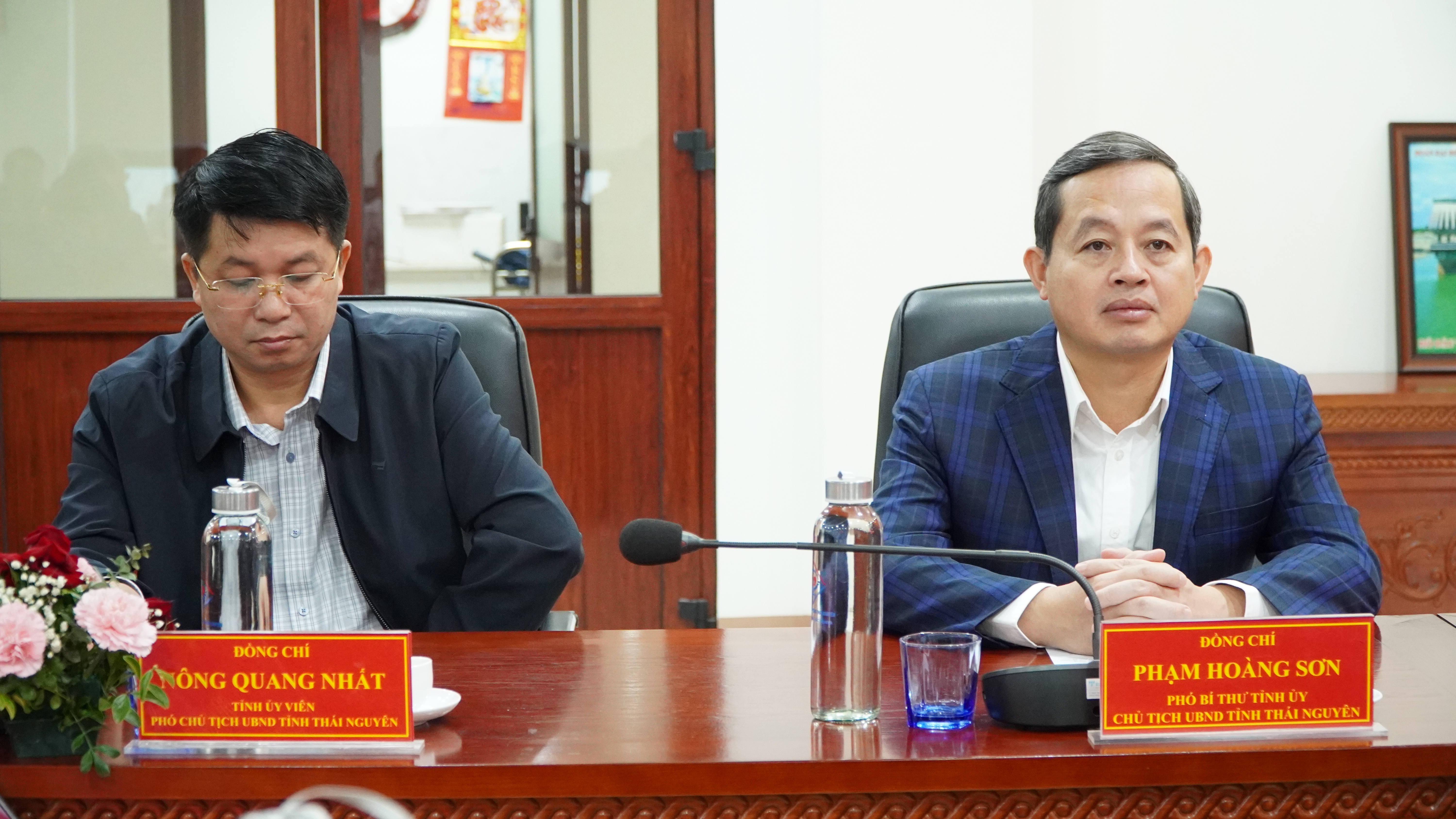 Đồng chí Phạm Hoàng Sơn - Phó Bí thư tỉnh ủy, Chủ tịch UBND tỉnh (áo xanh) và đồng chí Nông Quang Nhất - Tỉnh ủy viên, Phó Chủ tịch UBND tỉnh cùng tham dự buổi làm việc