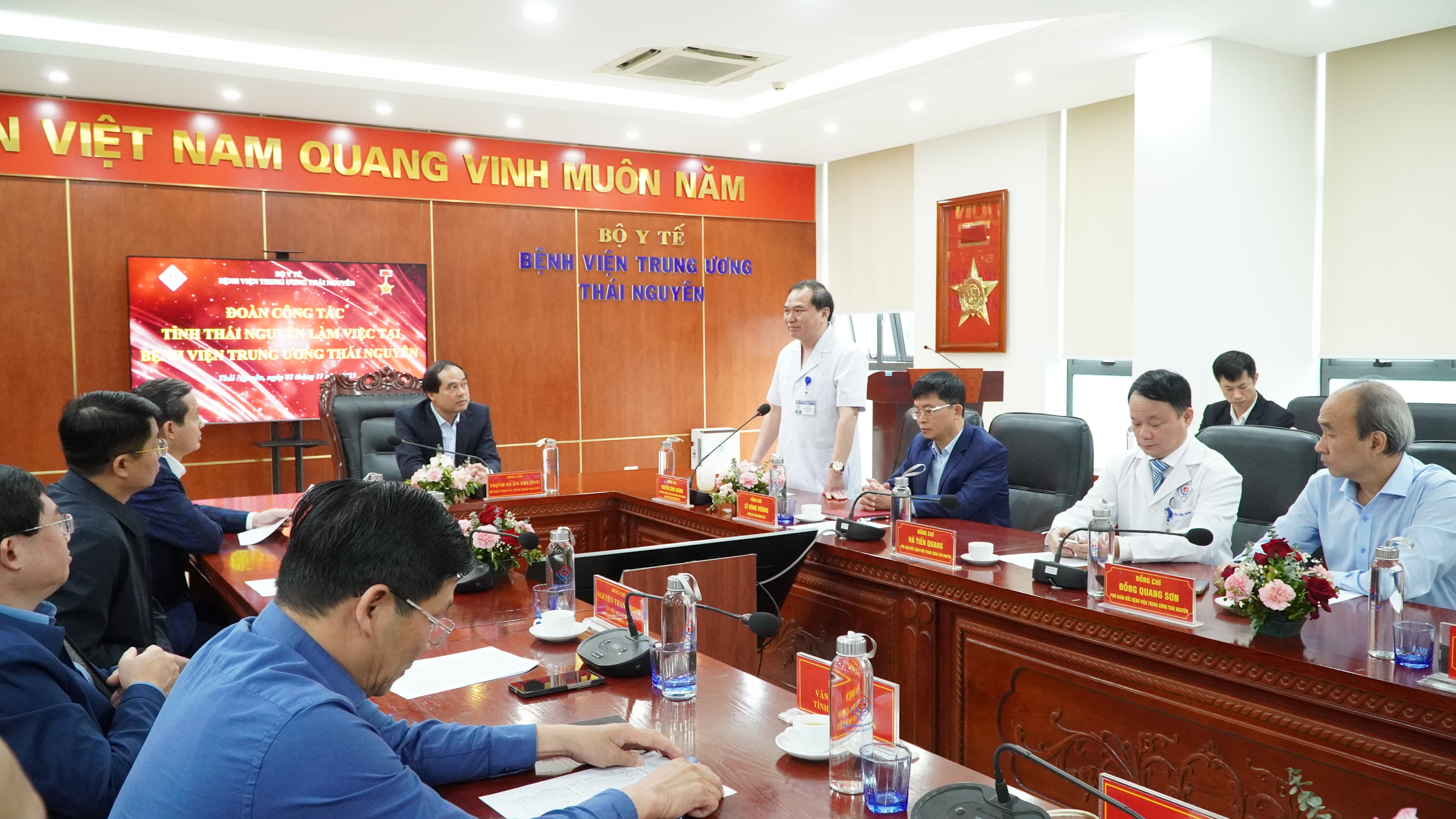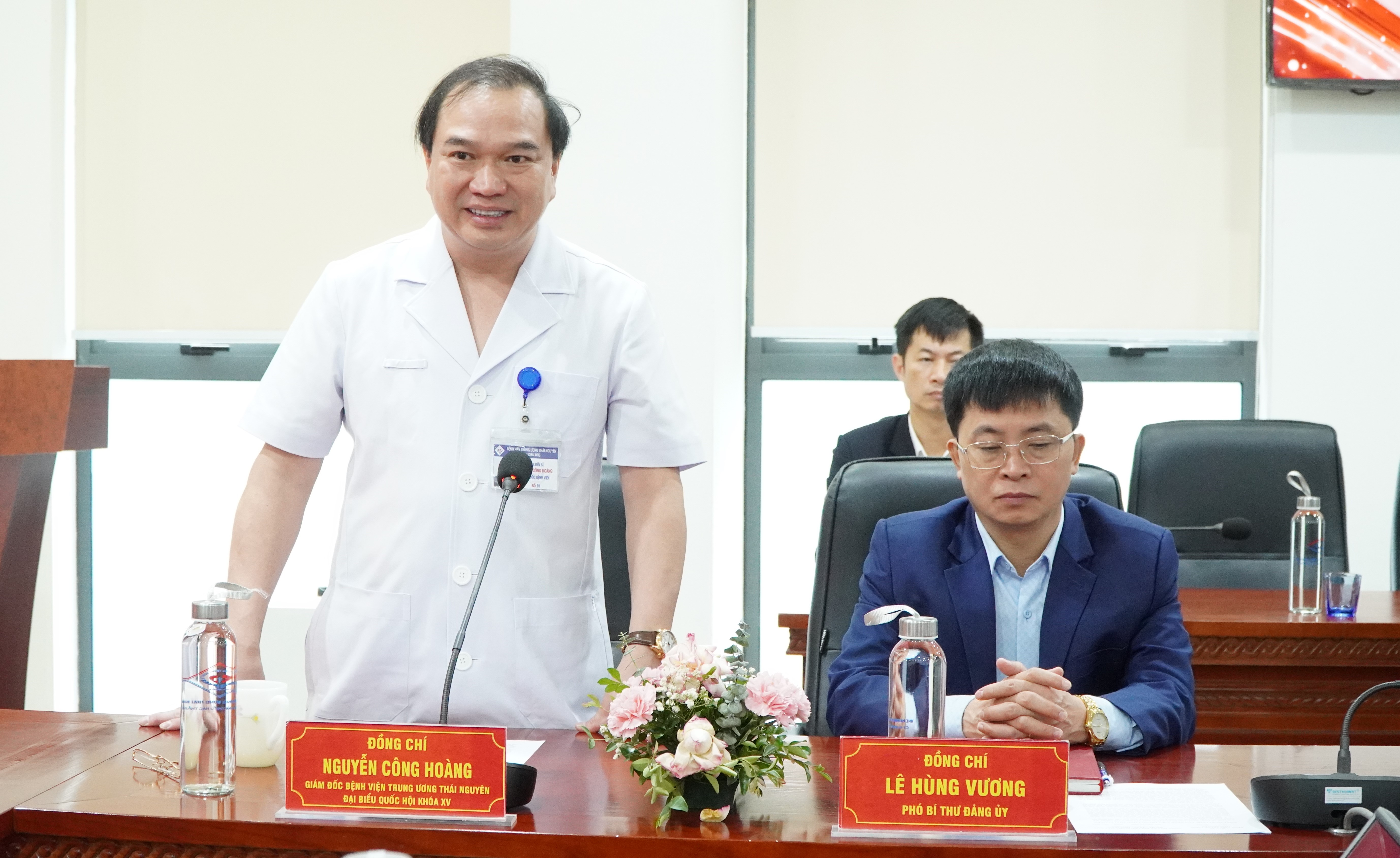 PGS.TS Nguyễn Công Hoàng - Đại biểu Quốc hội khóa XV, Bí thư Đảng ủy, Giám đốc Bệnh viện báo cáo nhanh với đoàn công tác của Tỉnh ủy, UBND tỉnh kết quả thực hiện nhiệm vụ chính trị, chuyên môn của Bệnh viện Trung ương Thái Nguyên.