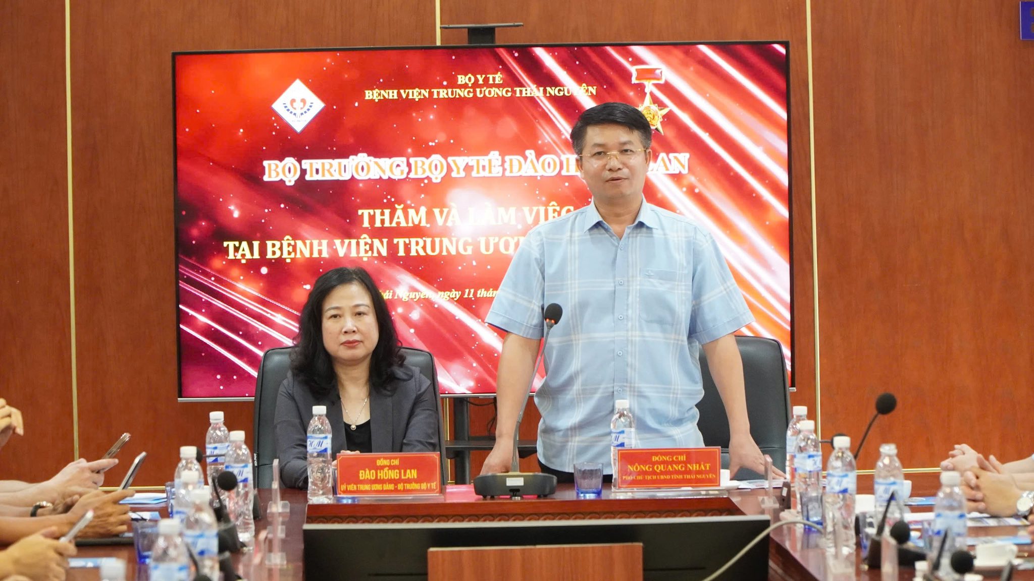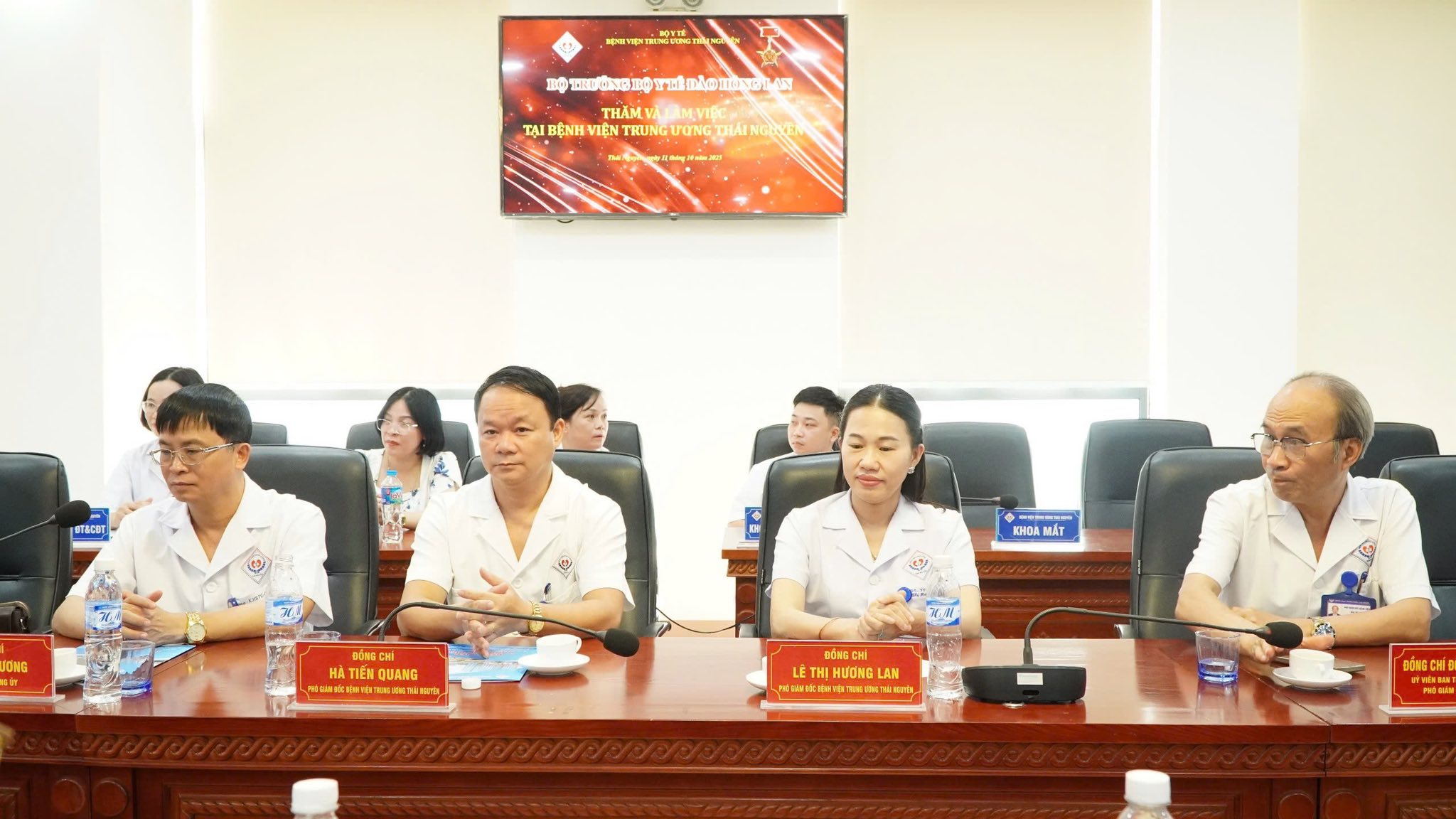 Tham dự buổi làm việc có đồng chí Nông Quang Nhất, Phó Chủ tịch UBND tỉnh Thái Nguyên; đồng chí Nguyễn Công Hoàng, Đại biểu Quốc hội khóa XV, Bí thư Đảng ủy, Giám đốc Bệnh viện Trung ương Thái Nguyên, các đồng chí trong Ban Thường vụ, Ban Giám đốc và lãnh đạo các khoa, phòng, trung tâm của Bệnh viện.
