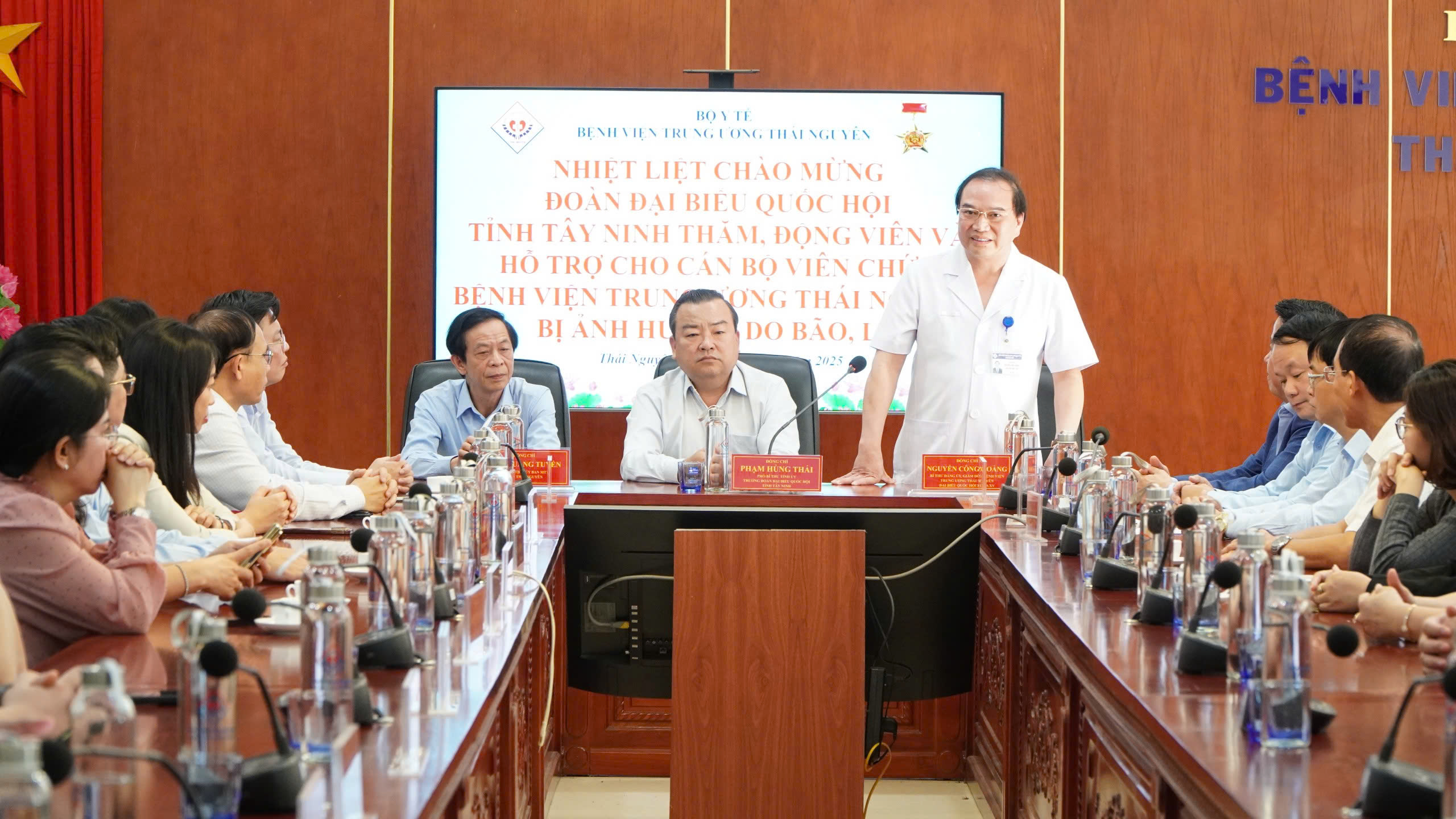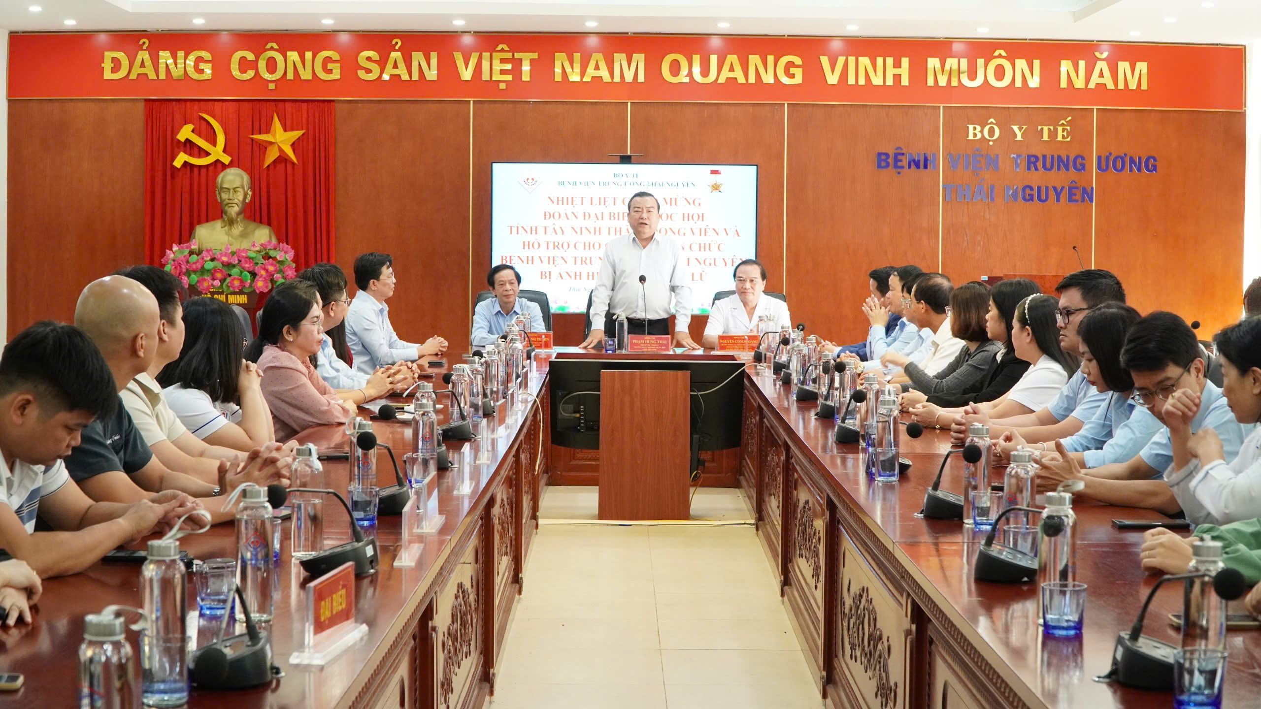 Phát biểu tại chương trình, PGS.TS. Nguyễn Công Hoàng – Giám đốc Bệnh viện bày tỏ sự cảm ơn sâu sắc tới Đoàn ĐBQH tỉnh Tây Ninh đã quan tâm, sẻ chia, hỗ trợ kịp thời cho cán bộ, viên chức Bệnh viện trong thời điểm khó khăn. Đồng chí nhấn mạnh: Do ảnh hưởng của hoàn lưu bão số 11, Thái Nguyên đã hứng chịu trận ngập lụt lịch sử, gây thiệt hại nặng nề về tài sản và đời sống nhân dân. Tại Bệnh viện Trung ương Thái Nguyên, tình trạng ngập lụt, mất điện, thiếu nước sạch, gián đoạn chuỗi cung ứng và thông tin liên lạc đã ảnh hưởng không nhỏ đến hoạt động khám, chữa bệnh. Nhiều cán bộ, viên chức của Bệnh viện cũng bị thiệt hại nặng về nhà cửa, tài sản, song vẫn nỗ lực bám trụ, duy trì công tác chuyên môn, đảm bảo phục vụ người bệnh an toàn, liên tục.