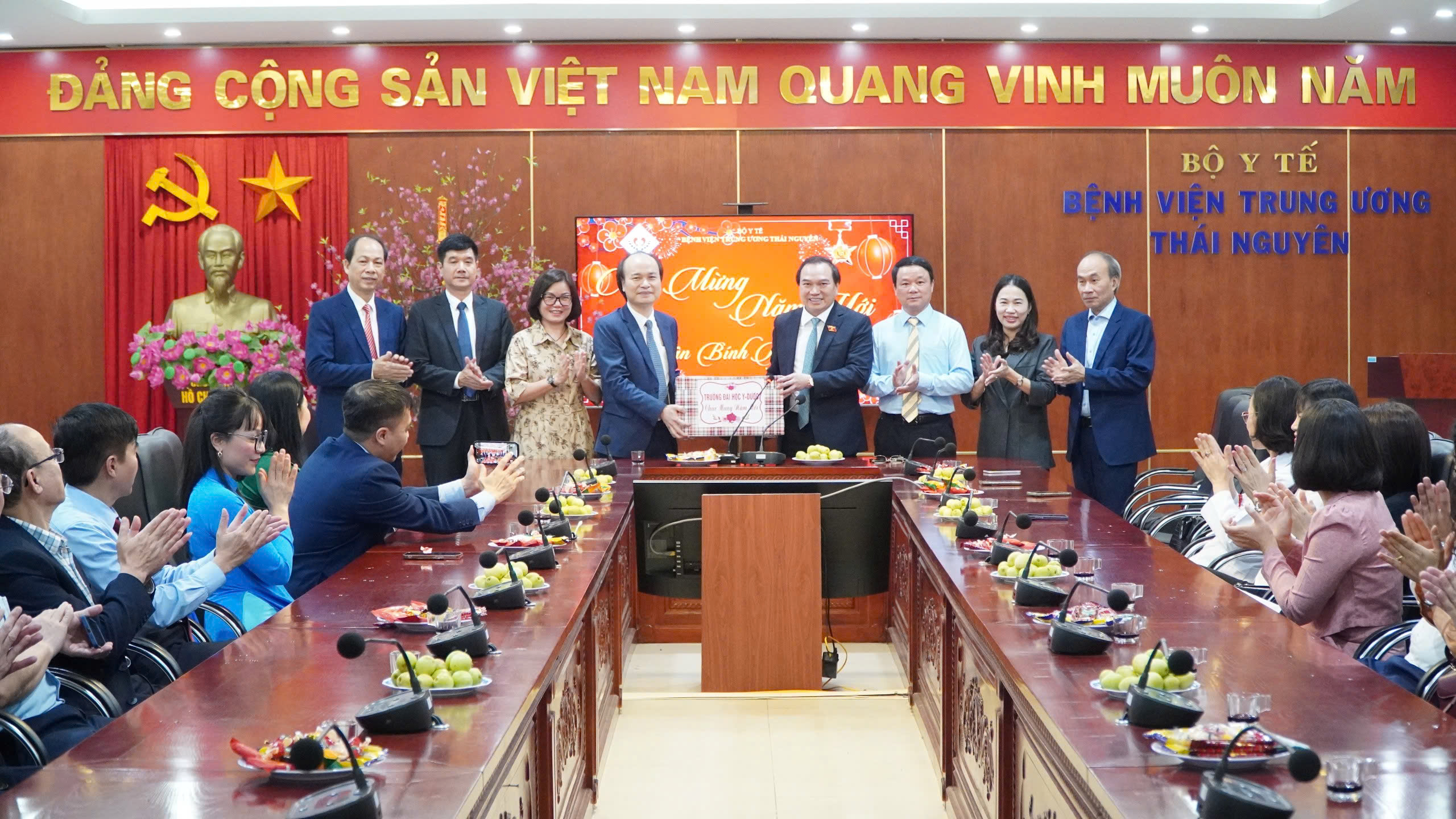 Đến thăm và chúc Tết Bệnh viện, GS.TS Nguyễn Tiến Dũng - Bí thư Đảng ủy, Hiệu trưởng Trường Đại học Y Dược, Đại học Thái Nguyên gửi lời chúc mừng năm mới tới tập thể cán bộ, viên chức Bệnh viện Trung ương Thái Nguyên. Đồng thời động viên, ghi nhận tinh thần trách nhiệm, sự nỗ lực của đội ngũ giảng viên, học viên nhà trường trong công tác trực Tết; mong muốn các em tiếp tục phát huy tinh thần học tập, rèn luyện, tích cực tham gia hoạt động chuyên môn, góp phần cùng đội ngũ thầy thuốc chăm sóc tốt sức khỏe nhân dân trong dịp Tết./.