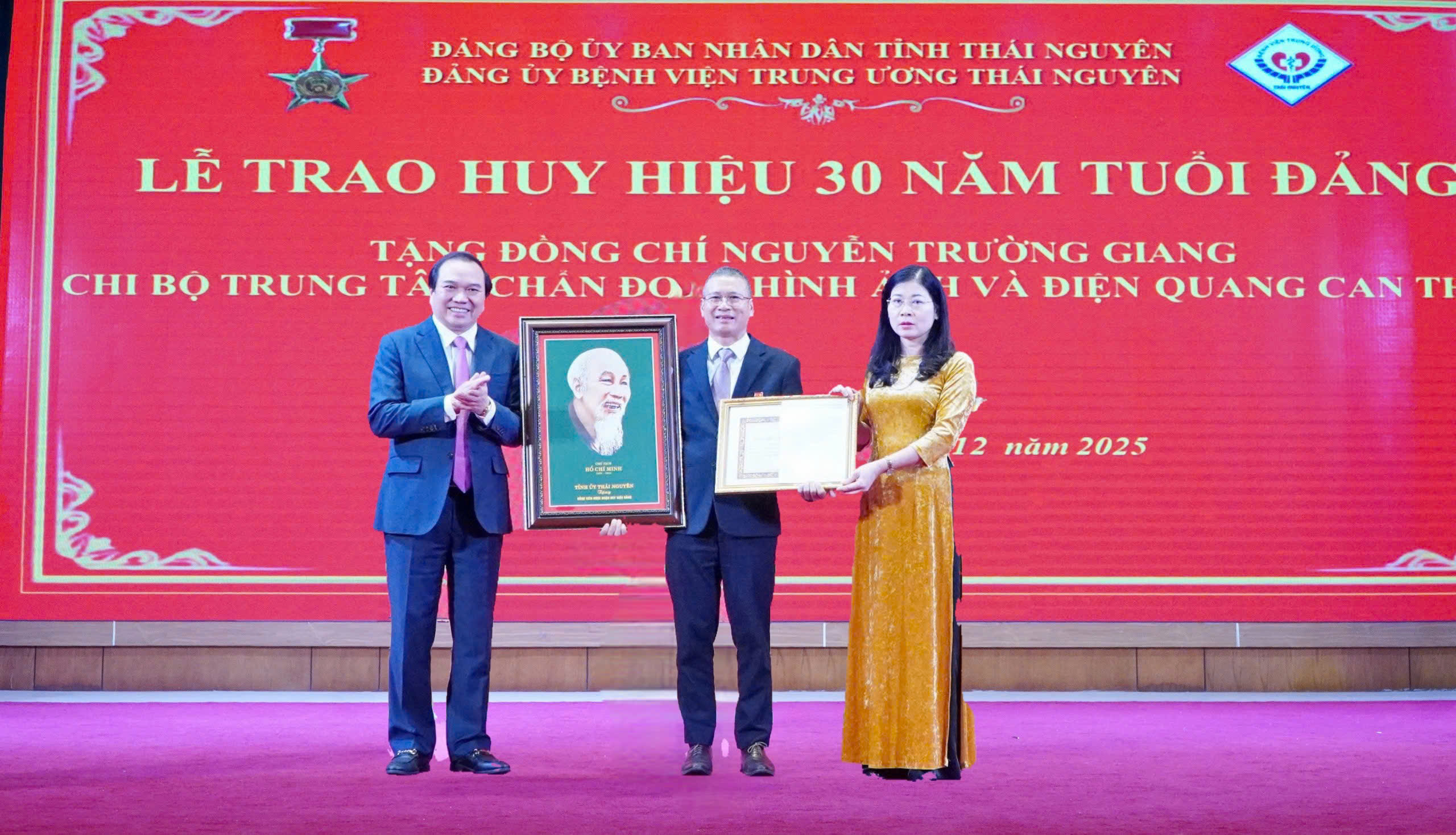 Đồng chí Mai Thị Nhài - Phó Bí thư chuyên trách Đảng ủy UBND tỉnh Thái Nguyên và Đồng chí Nguyễn Công Hoàng – Đại biểu Quốc hội khóa XV, Bí thư Đảng ủy, Giám đốc Bệnh viện trao Huy hiệu 30 năm tuổi Đảng cho đồng chí Nguyễn Trường Giang - Bí thư Chi bộ Trung tâm Chẩn đoán hình ảnh và Điện quang can thiệp Bệnh viện