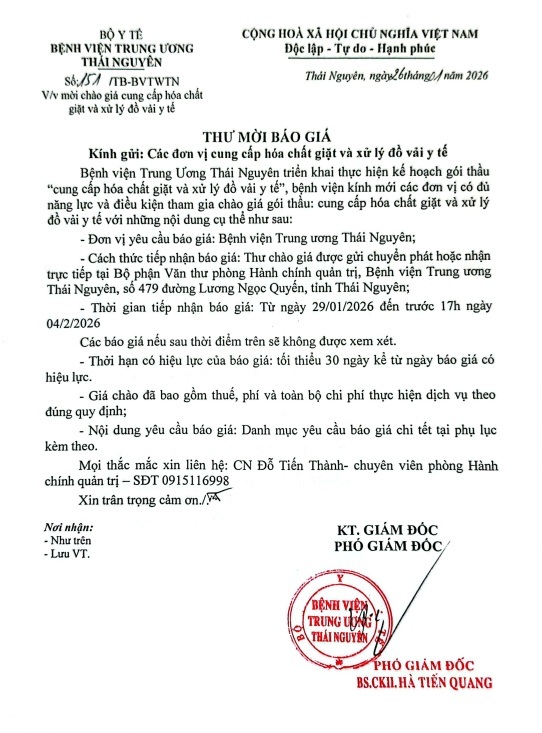 Xem thêm: Mời chào giá, cung cấp hóa chất giặt, và xử lý đồ vải y tế https://bvdktuthainguyen.gov.vn/page/khoa-noi-soi