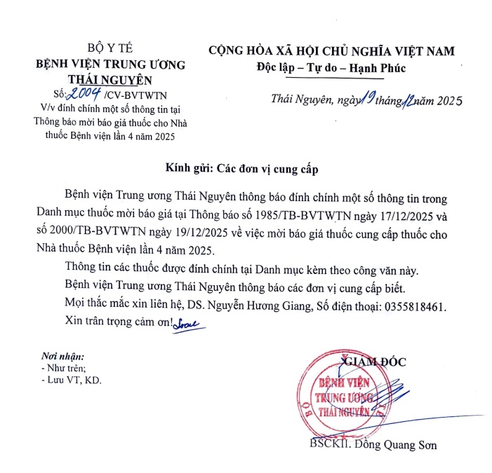 Thông báo đính chính một số thông tin trong danh mục thuốc mời báo giá cung cấp thuốc nhà thuốc bệnh viện lần 4 năm 2025