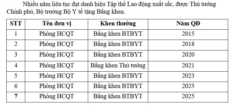 Trải qua hơn 70 năm xây dựng và phát triển, phòng Hành chính quản trị luôn hoàn thành tốt nhiệm vụ được giao, từng bước trưởng thành và lớn mạnh cùng với sự phát triển của Bệnh viện. Tập thể cán bộ viên chức của Phòng đã không ngừng nỗ lực, sáng tạo, phát huy tinh thần trách nhiệm, kỷ luật, góp phần xây dựng môi trường làm việc chuyên nghiệp, nền nếp, hỗ trợ tích cực cho công tác chuyên môn. Đội ngũ cán bộ, viên chức của Phòng được quan tâm đào tạo, bồi dưỡng cả về chuyên môn và kỹ năng quản lý, chuyên nghiệp đáp ứng yêu cầu ngày càng cao của ngành y tế trong giai đoạn đổi mới.
