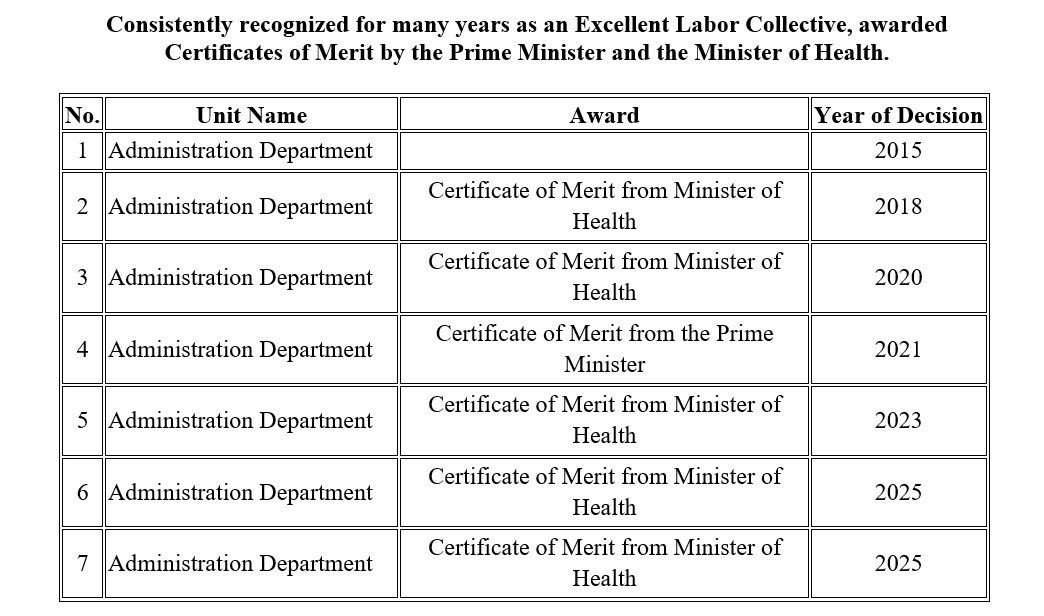 Over the course of more than 70 years of construction and development, the Administration Department has consistently fulfilled its assigned duties, gradually growing and maturing alongside the hospital. The department’s team of officials and staff have made continuous efforts, showing creativity, responsibility, and discipline, contributing to building a professional and orderly working environment that actively supports medical operations. The department's personnel have been given strong emphasis on training and development in both professional expertise and management skills, meeting the increasingly demanding requirements of the healthcare sector during this period of transformation.